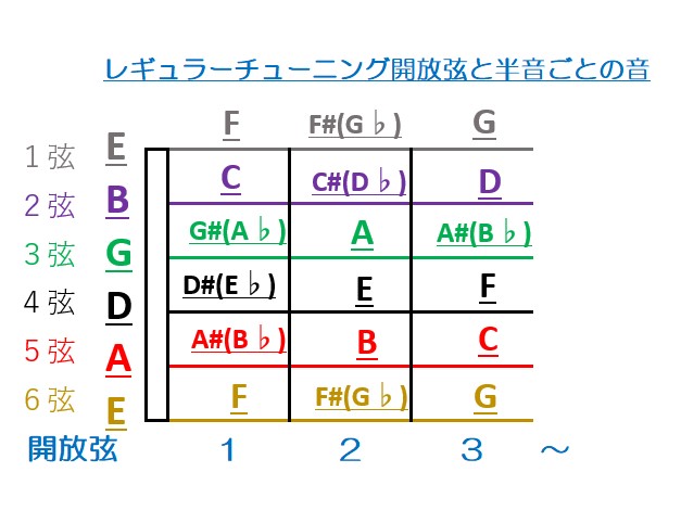 EとFやBとCは半音(1フレット)分ずつずれているため、わかりやすいかもしれません。
